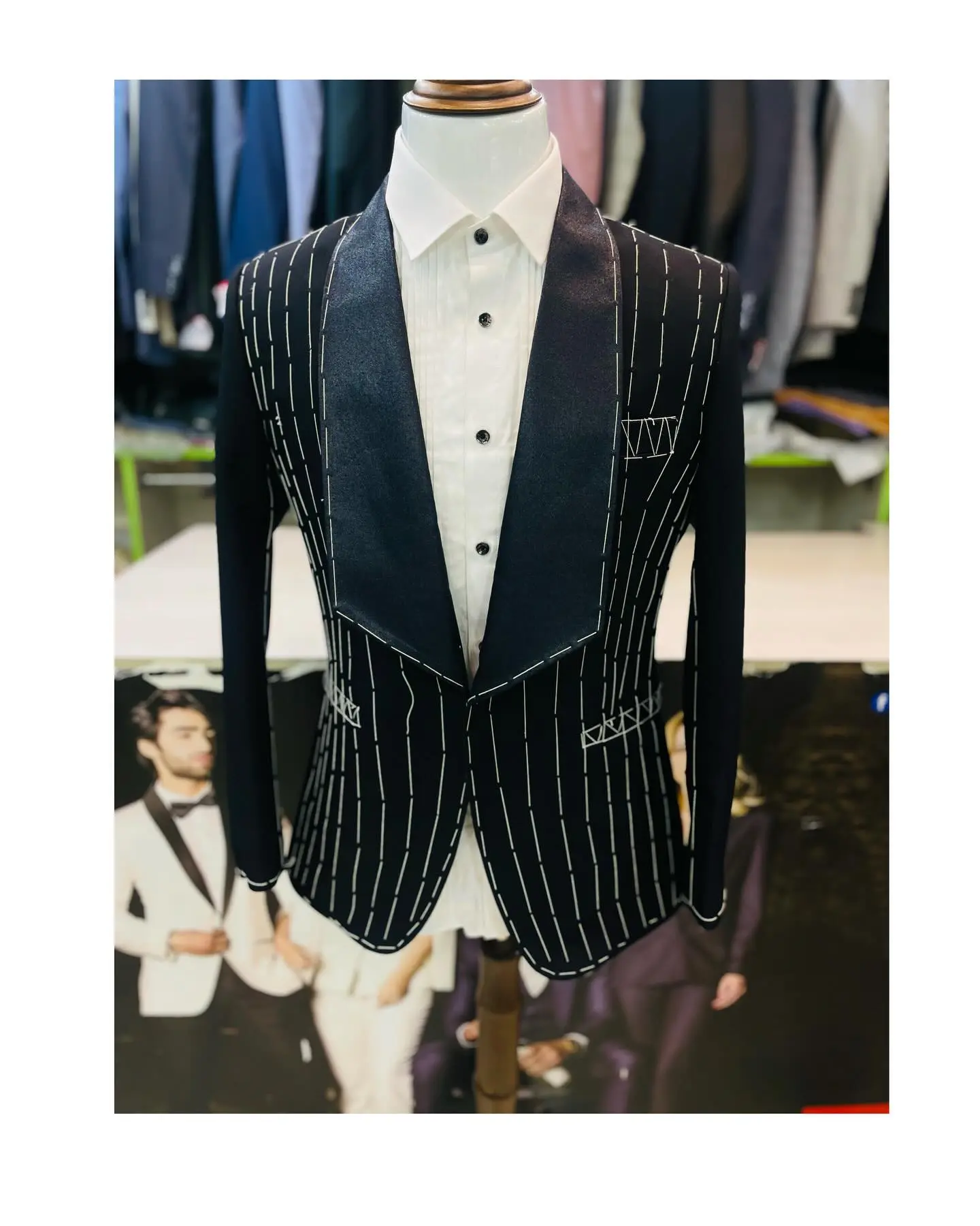 Tailored from a premium suiting fabric with a smooth matte finish, the design features a structured silhouette, standing Nehru collar, and hand-finished detailing that speaks of understated luxury. The minimalist lines and deep black tone create a statement of quiet power and sophistication.