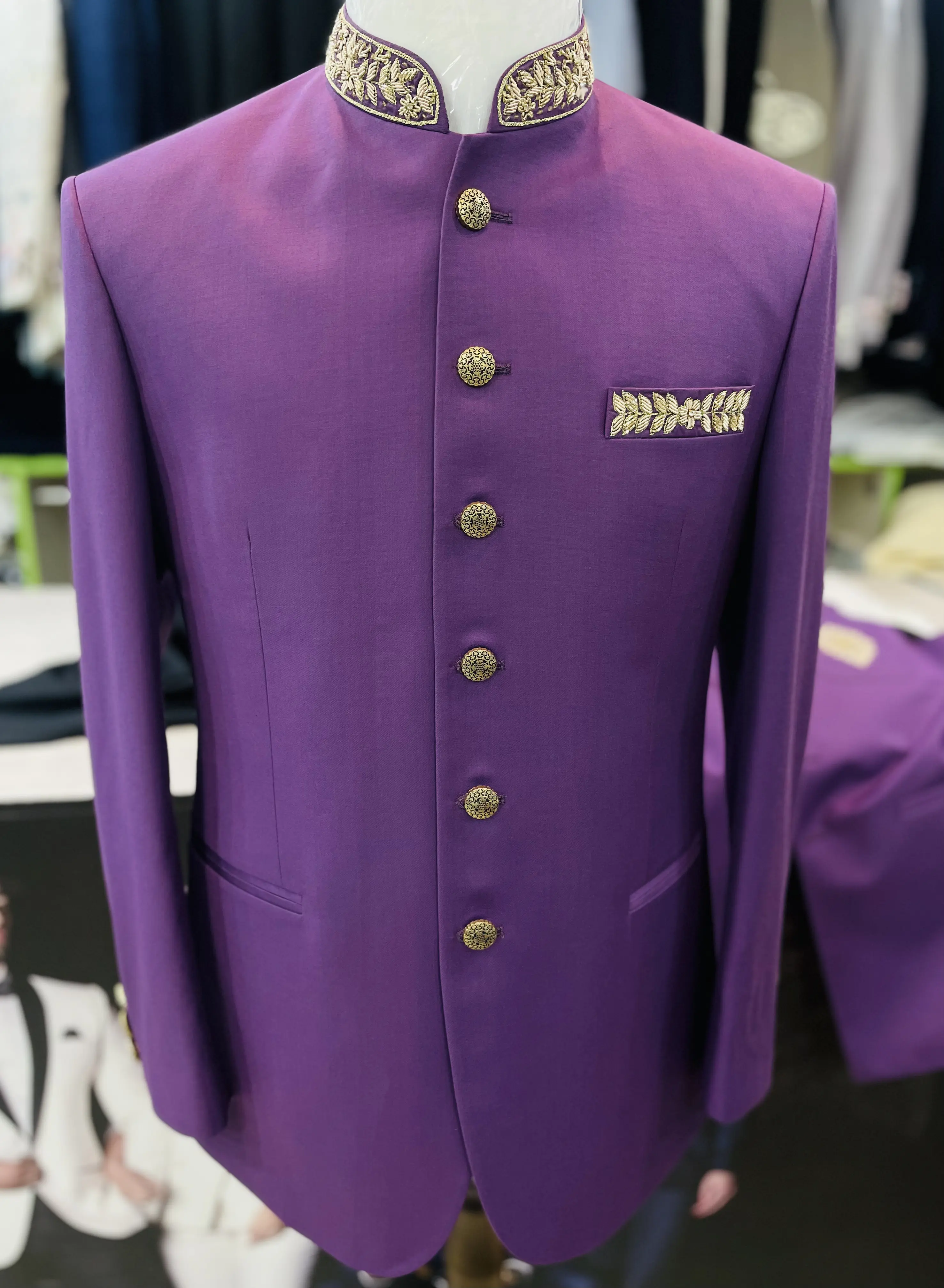 Tailored from a premium suiting fabric with a smooth matte finish, the design features a structured silhouette, standing Nehru collar, and hand-finished detailing that speaks of understated luxury. The minimalist lines and deep black tone create a statement of quiet power and sophistication.