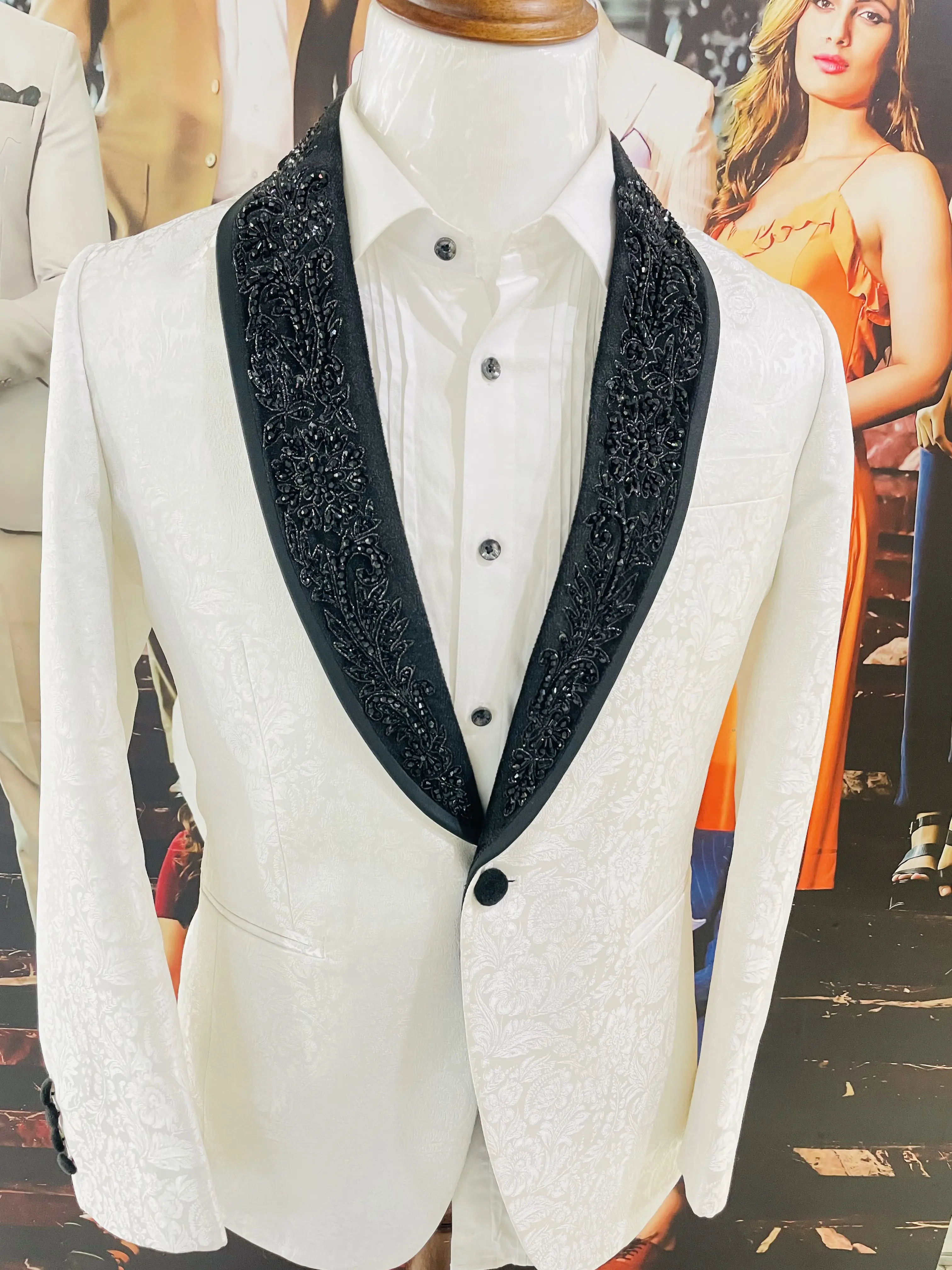 Tailored from a premium suiting fabric with a smooth matte finish, the design features a structured silhouette, standing Nehru collar, and hand-finished detailing that speaks of understated luxury. The minimalist lines and deep black tone create a statement of quiet power and sophistication.