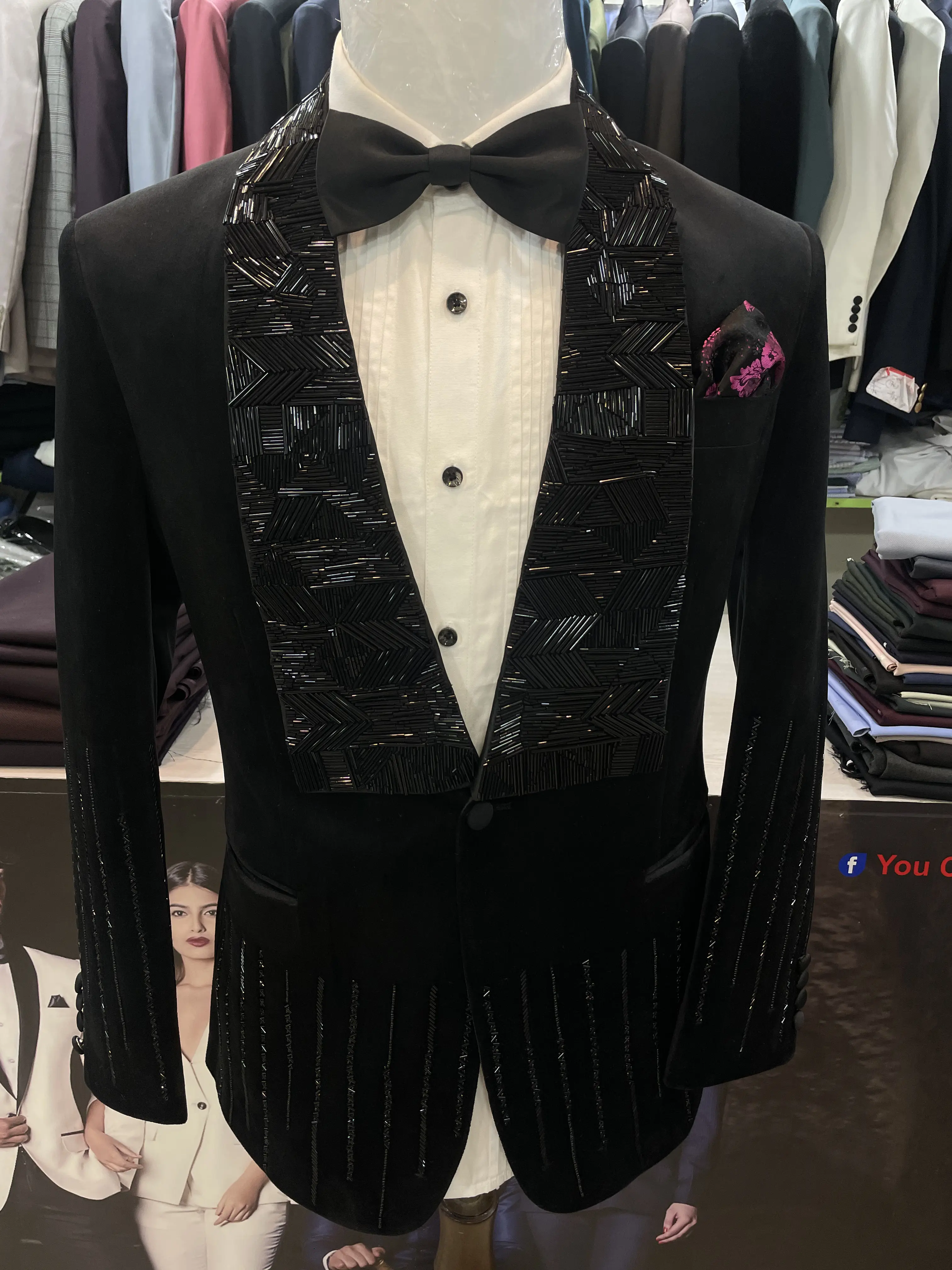Tailored from a premium suiting fabric with a smooth matte finish, the design features a structured silhouette, standing Nehru collar, and hand-finished detailing that speaks of understated luxury. The minimalist lines and deep black tone create a statement of quiet power and sophistication.