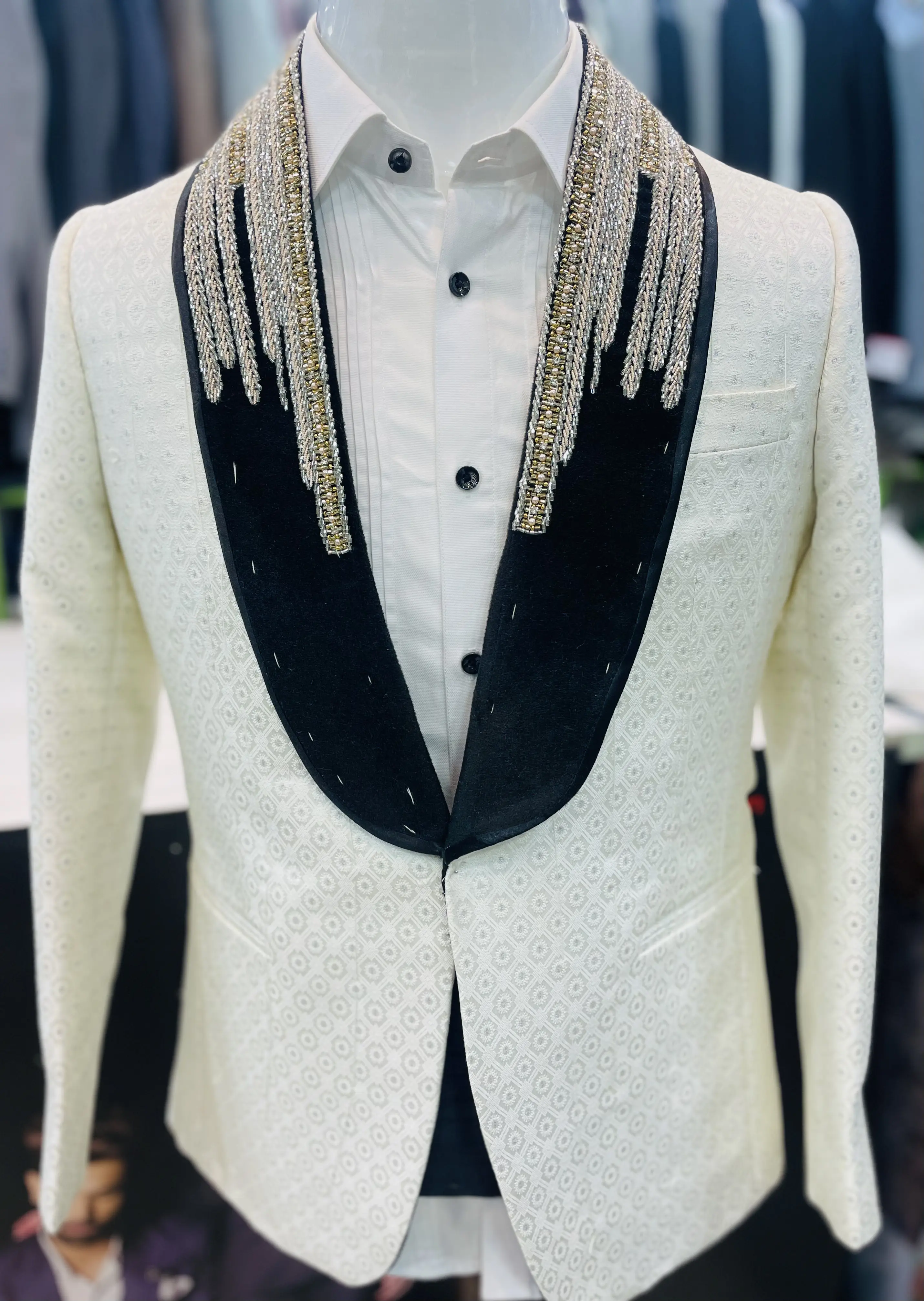 Tailored from a premium suiting fabric with a smooth matte finish, the design features a structured silhouette, standing Nehru collar, and hand-finished detailing that speaks of understated luxury. The minimalist lines and deep black tone create a statement of quiet power and sophistication.