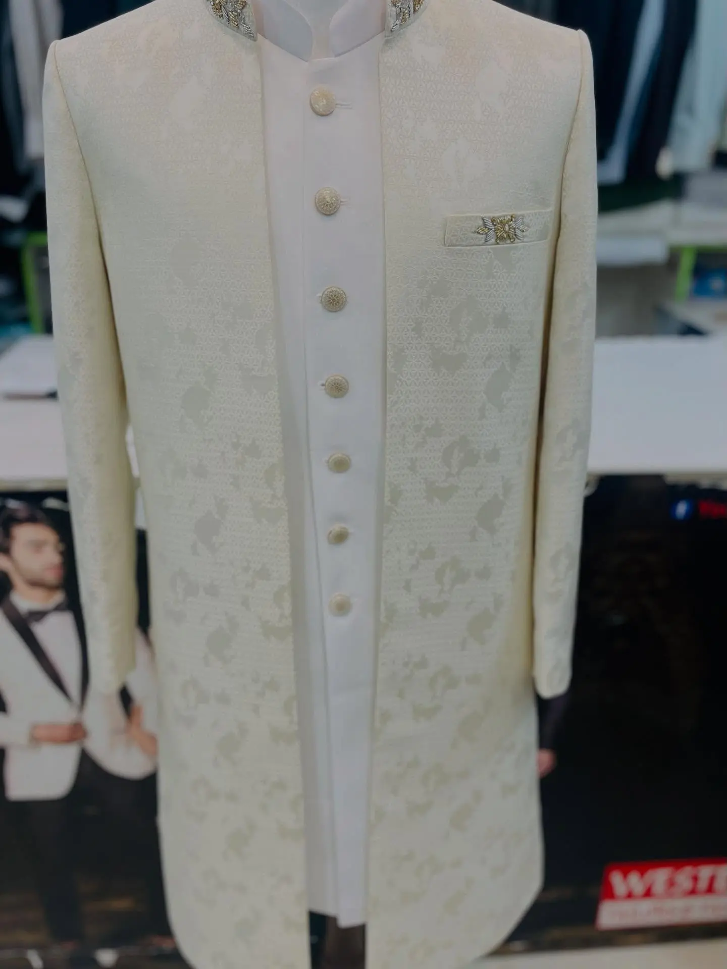 Tailored from a premium suiting fabric with a smooth matte finish, the design features a structured silhouette, standing Nehru collar, and hand-finished detailing that speaks of understated luxury. The minimalist lines and deep black tone create a statement of quiet power and sophistication.