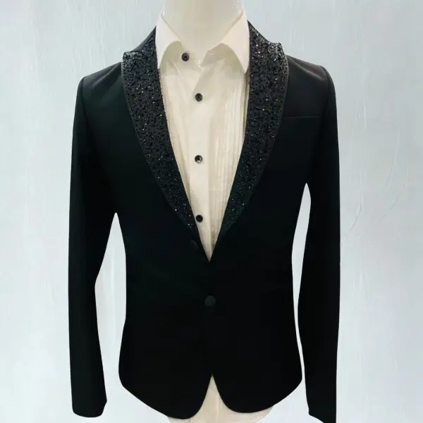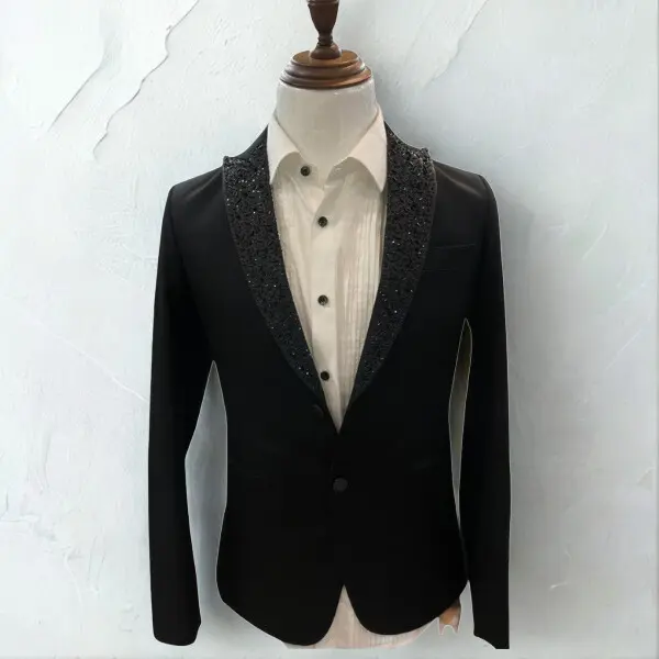 Exude refined sophistication with this elegant black men’s blazer, designed for modern gentlemen who appreciate subtle luxury. The embellished shawl lapel adds a touch of glamour while maintaining a clean, timeless silhouette perfect for formal and evening wear.