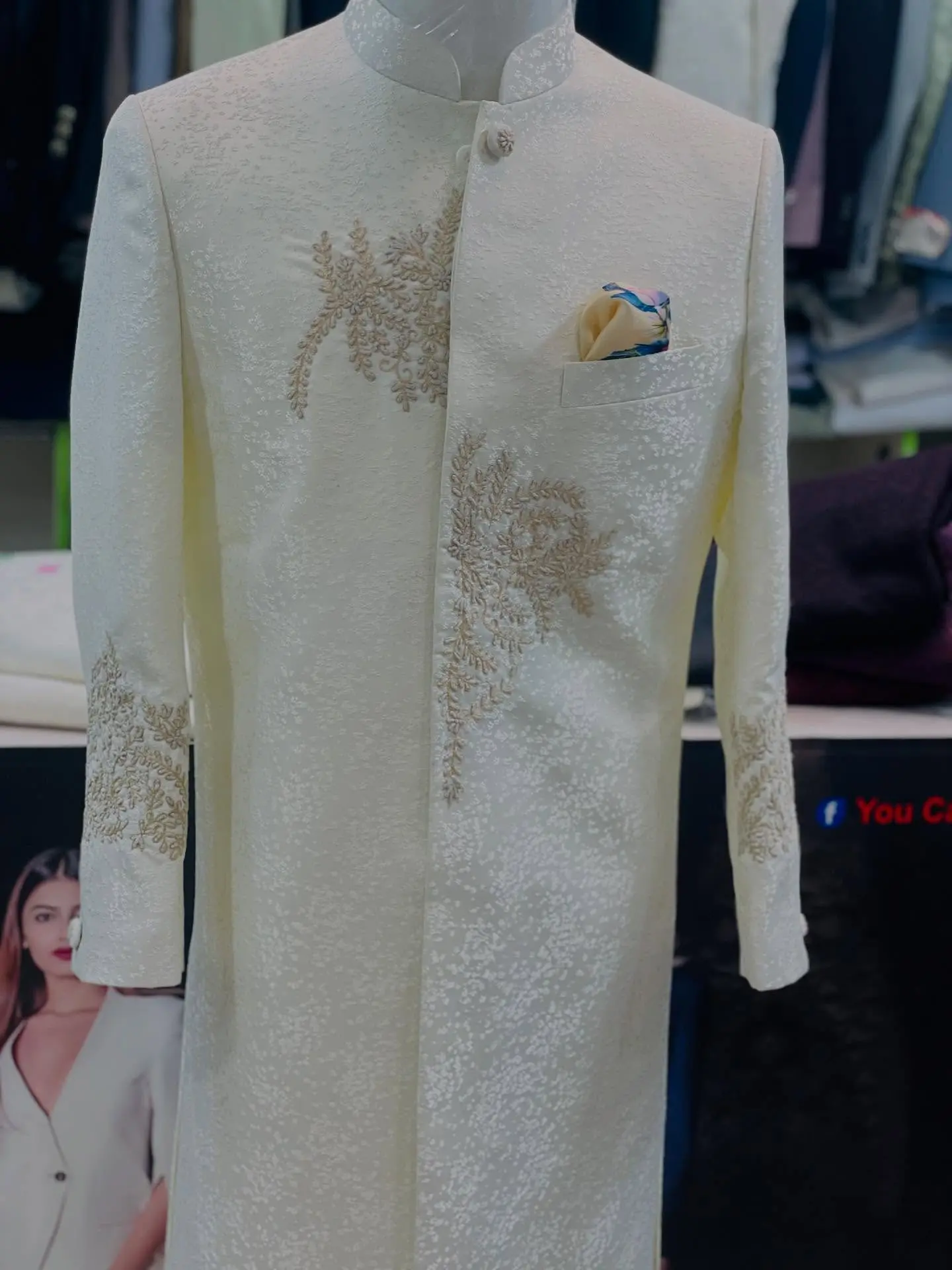 Tailored from a premium suiting fabric with a smooth matte finish, the design features a structured silhouette, standing Nehru collar, and hand-finished detailing that speaks of understated luxury. The minimalist lines and deep black tone create a statement of quiet power and sophistication.