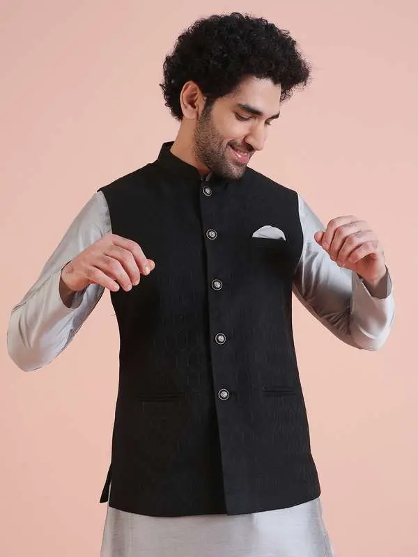 Tailored from a premium suiting fabric with a smooth matte finish, the design features a structured silhouette, standing Nehru collar, and hand-finished detailing that speaks of understated luxury. The minimalist lines and deep black tone create a statement of quiet power and sophistication.