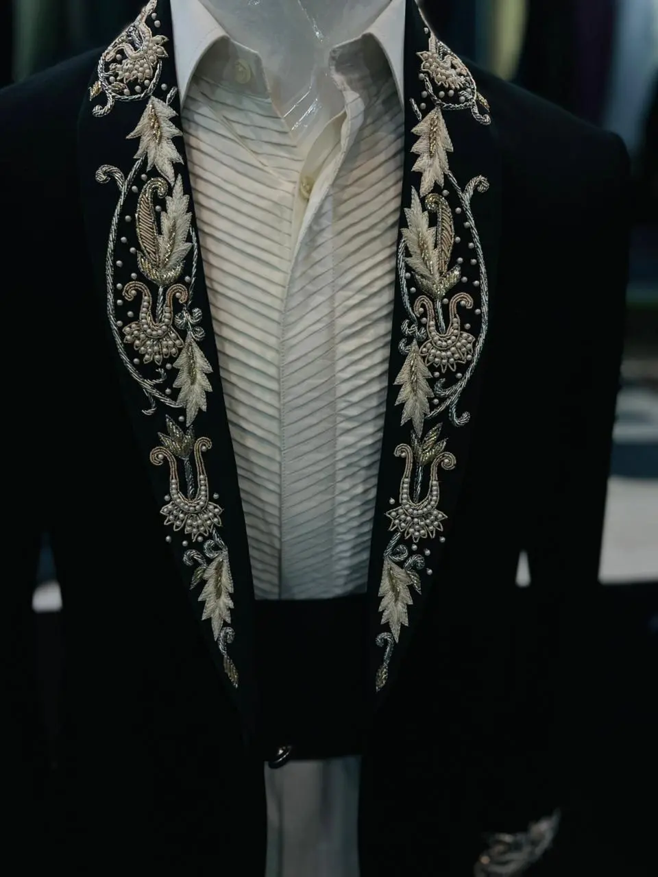 Make a powerful style statement with this premium black embroidered blazer, designed for men who appreciate elegance with a bold, luxurious touch. Featuring intricate handcrafted-style embroidery on the shawl lapel and cuffs, this blazer blends classic tailoring with modern sophistication—perfect for standout formal occasions.