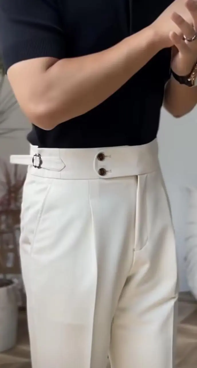 Minimal elegance meets modern luxury with our Premium Ivory Gurkha Pants. Designed for men who appreciate refined tailoring and clean sophistication, these trousers feature a signature high-waist Gurkha waistband with side adjuster detailing for a sharp, belt-free finish. Perfect for creating a confident and polished appearance from office hours to formal occasions.
