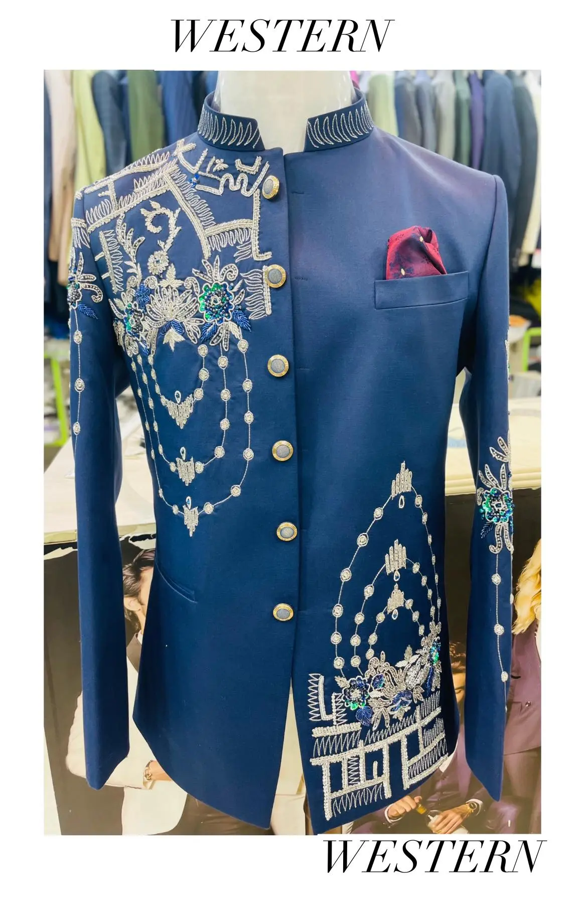 Tailored from a premium suiting fabric with a smooth matte finish, the design features a structured silhouette, standing Nehru collar, and hand-finished detailing that speaks of understated luxury. The minimalist lines and deep black tone create a statement of quiet power and sophistication.