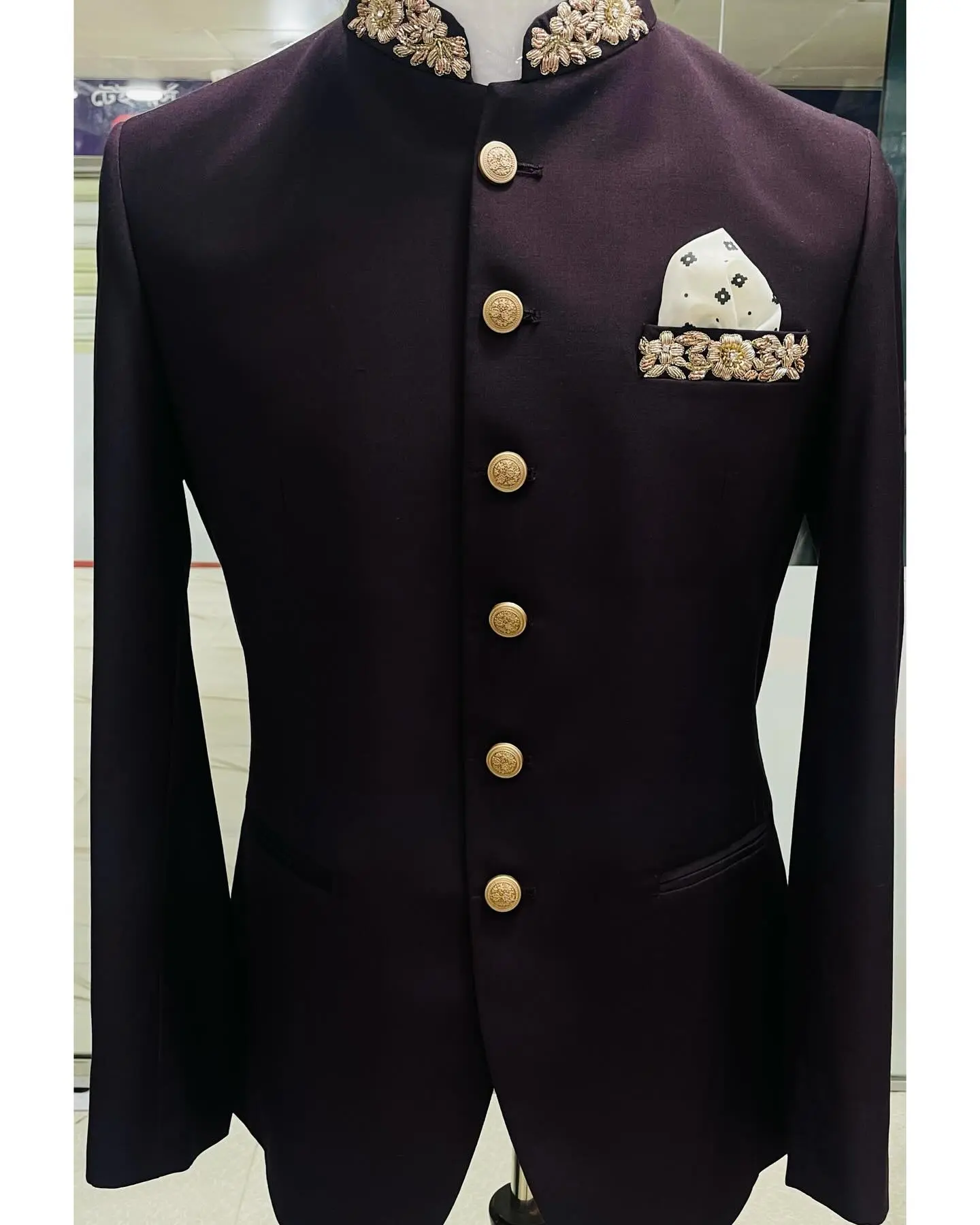 Tailored from a premium suiting fabric with a smooth matte finish, the design features a structured silhouette, standing Nehru collar, and hand-finished detailing that speaks of understated luxury. The minimalist lines and deep black tone create a statement of quiet power and sophistication.