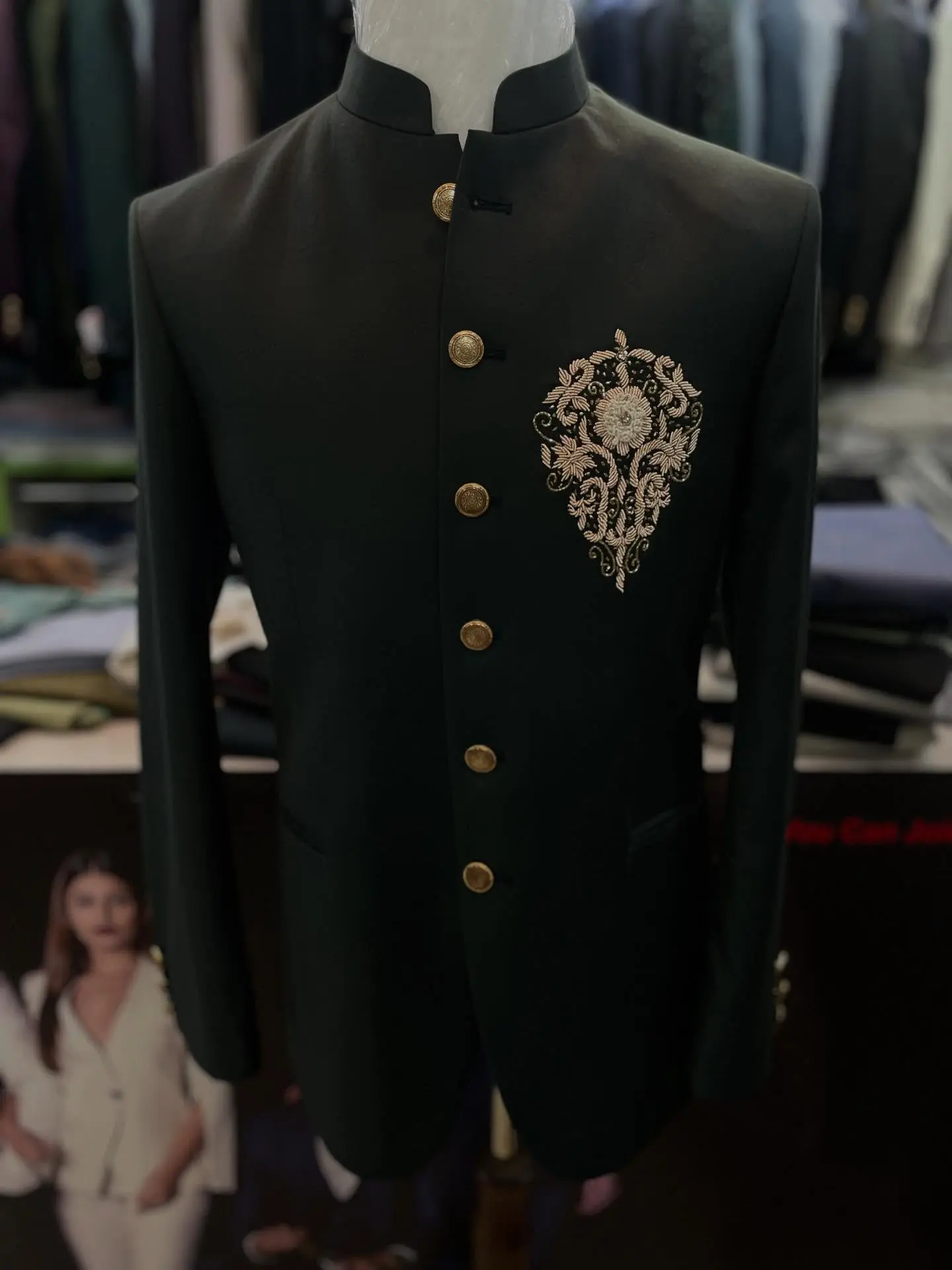 Tailored from a premium suiting fabric with a smooth matte finish, the design features a structured silhouette, standing Nehru collar, and hand-finished detailing that speaks of understated luxury. The minimalist lines and deep black tone create a statement of quiet power and sophistication.