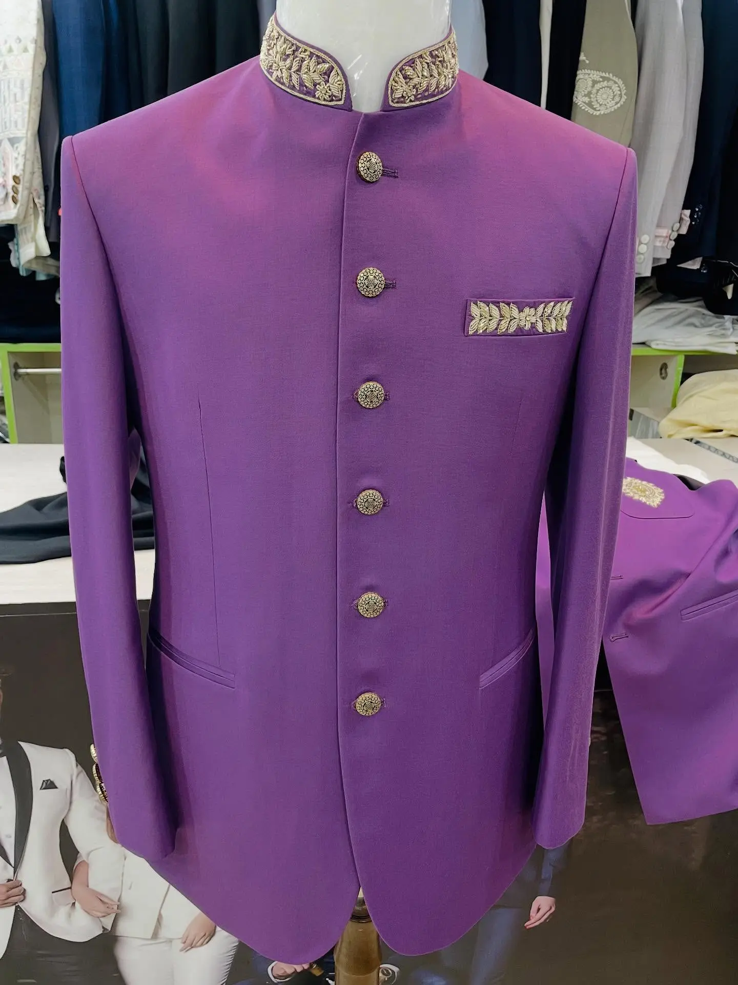 Tailored from a premium suiting fabric with a smooth matte finish, the design features a structured silhouette, standing Nehru collar, and hand-finished detailing that speaks of understated luxury. The minimalist lines and deep black tone create a statement of quiet power and sophistication.