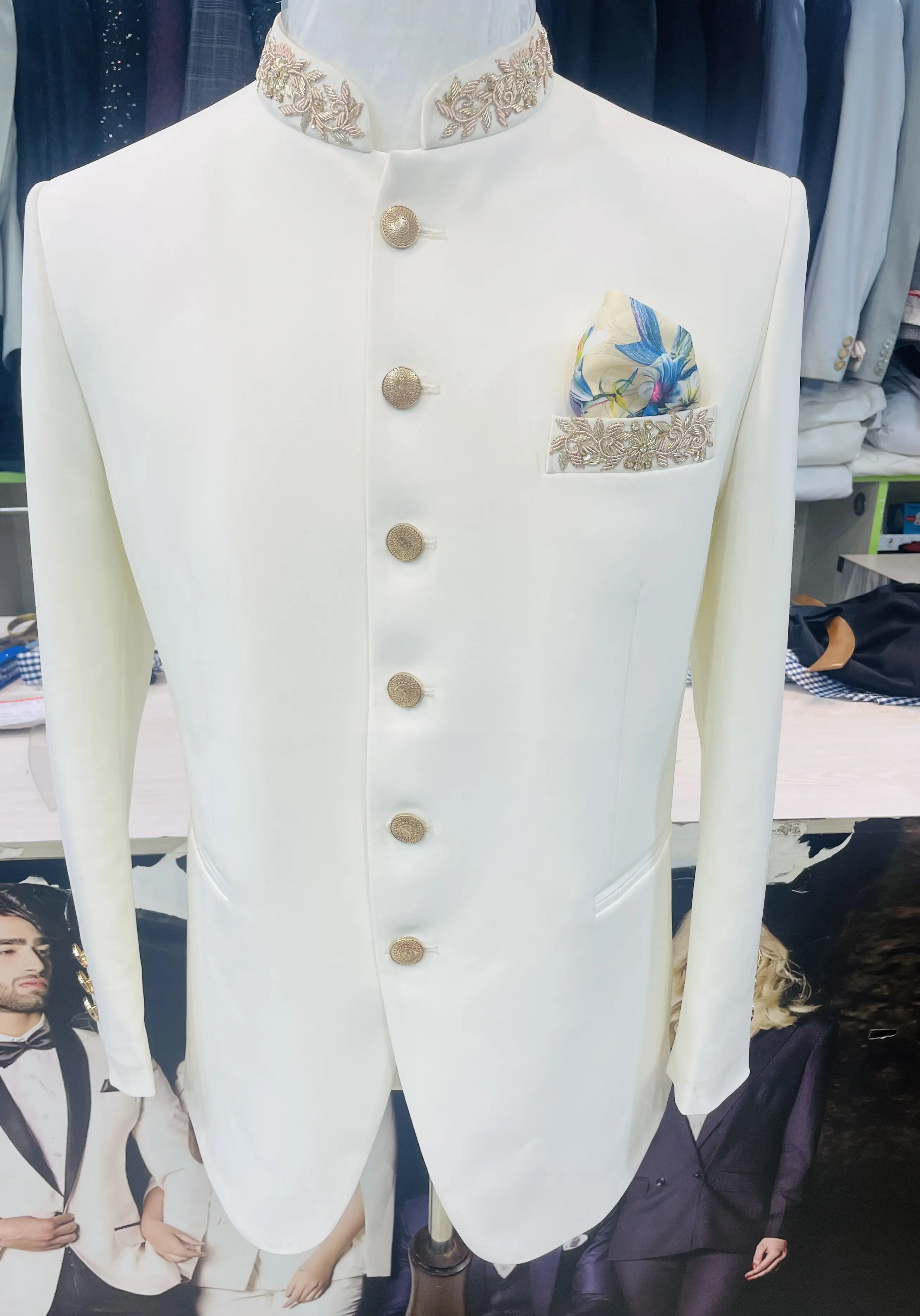 Tailored from a premium suiting fabric with a smooth matte finish, the design features a structured silhouette, standing Nehru collar, and hand-finished detailing that speaks of understated luxury. The minimalist lines and deep black tone create a statement of quiet power and sophistication.