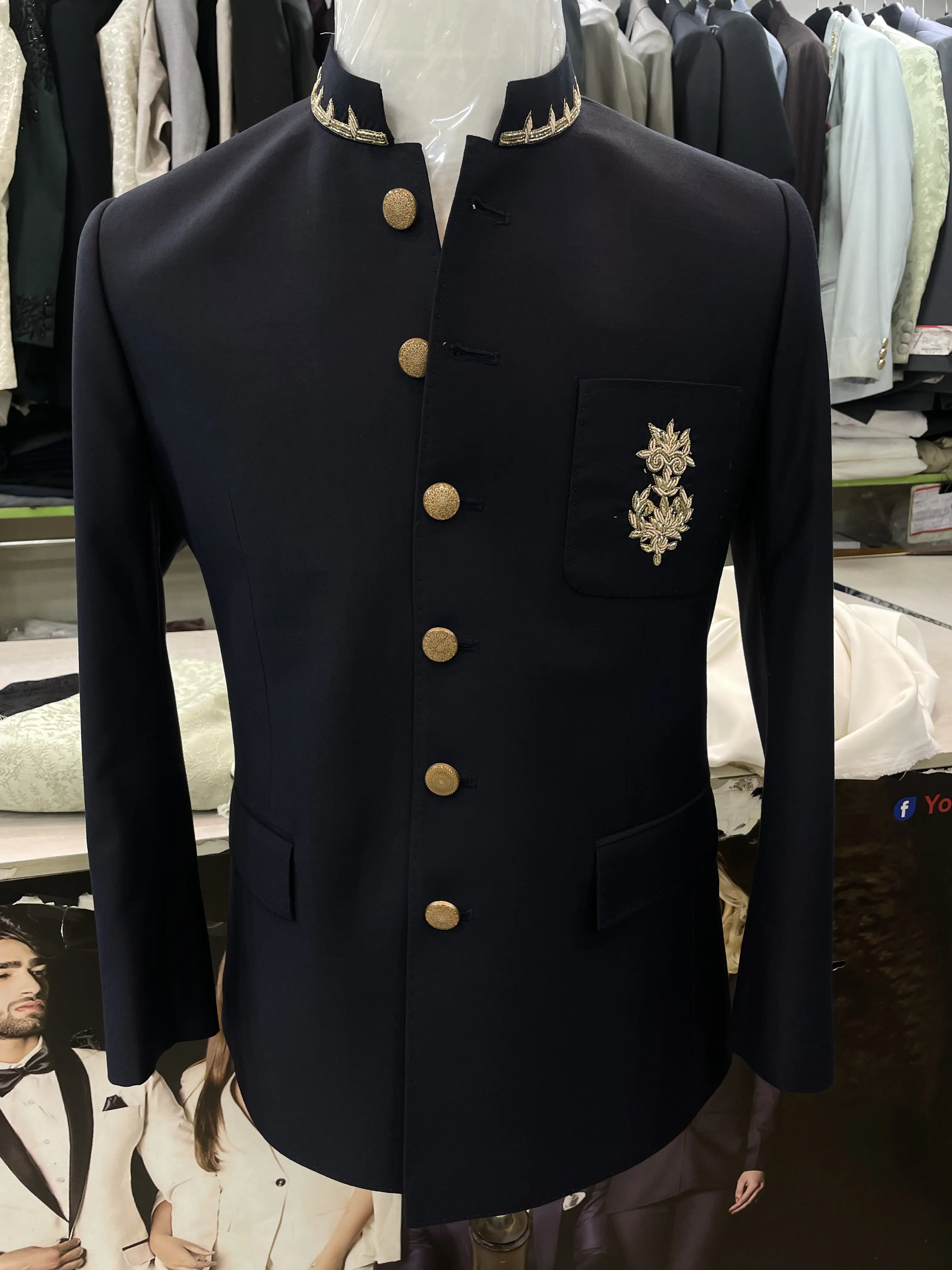 Tailored from a premium suiting fabric with a smooth matte finish, the design features a structured silhouette, standing Nehru collar, and hand-finished detailing that speaks of understated luxury. The minimalist lines and deep black tone create a statement of quiet power and sophistication.