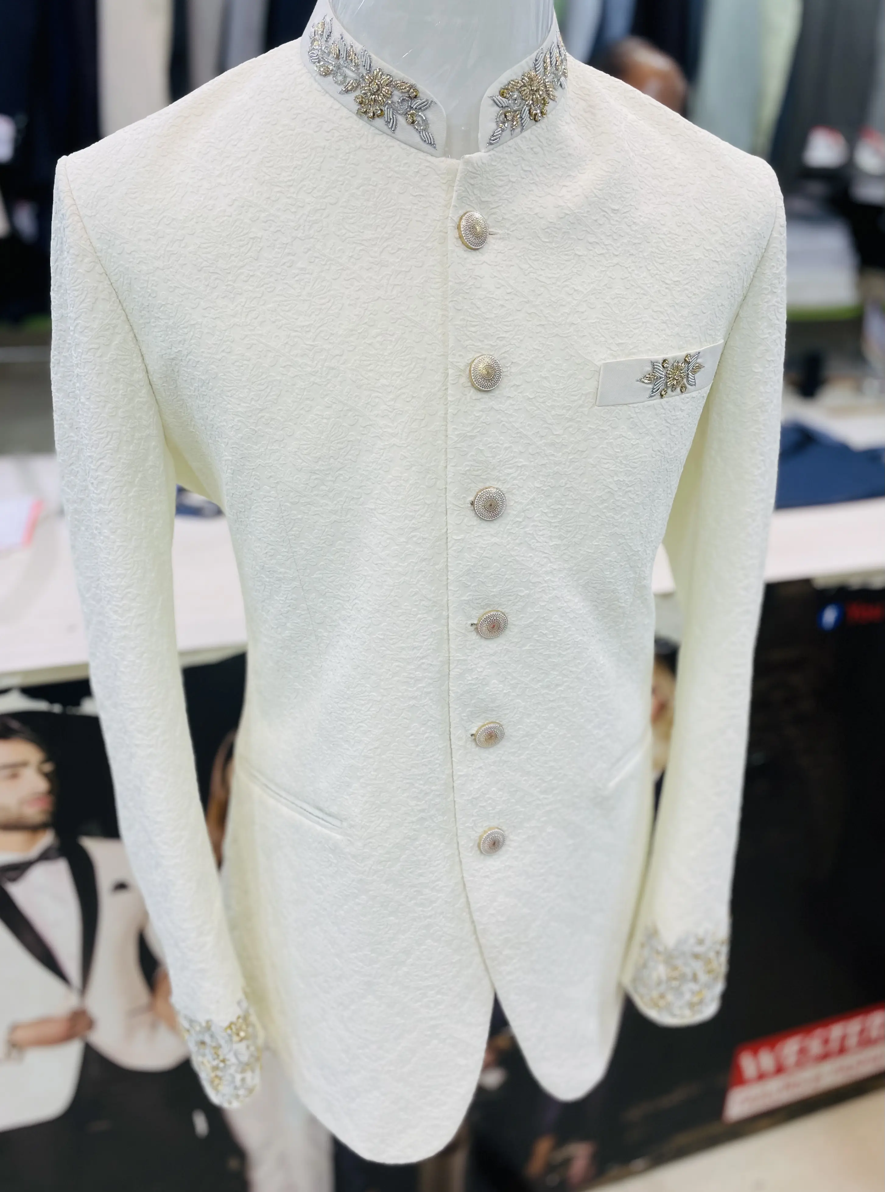 Tailored from a premium suiting fabric with a smooth matte finish, the design features a structured silhouette, standing Nehru collar, and hand-finished detailing that speaks of understated luxury. The minimalist lines and deep black tone create a statement of quiet power and sophistication.