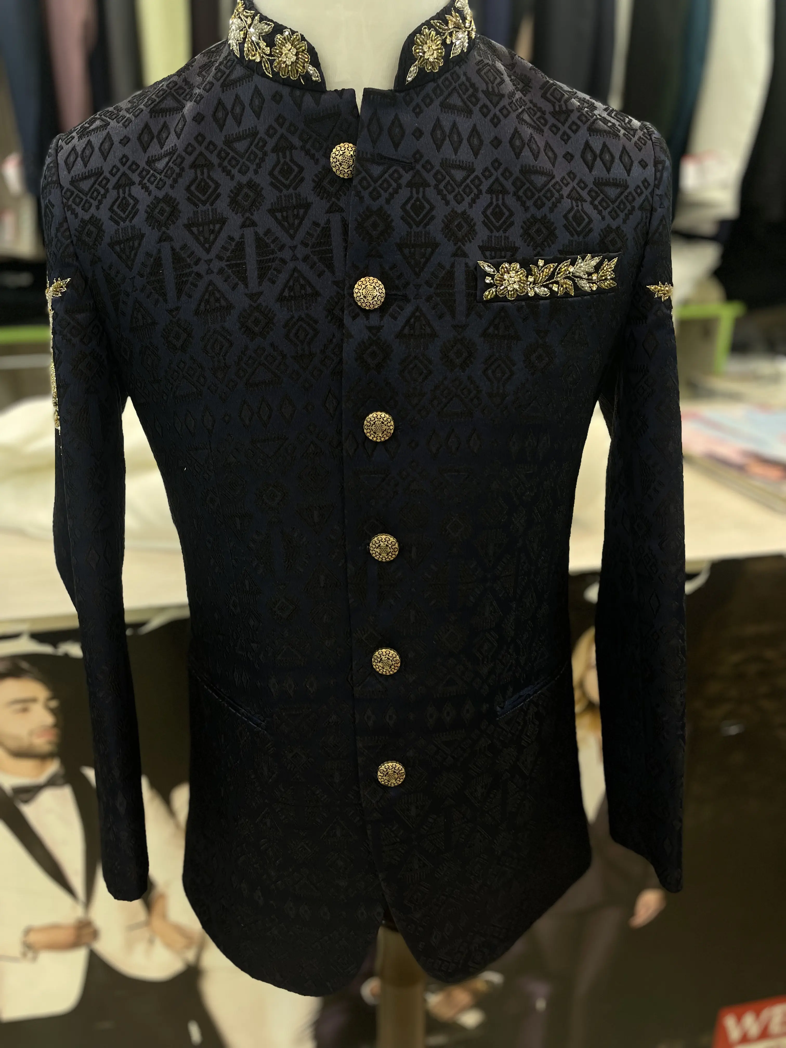 Tailored from a premium suiting fabric with a smooth matte finish, the design features a structured silhouette, standing Nehru collar, and hand-finished detailing that speaks of understated luxury. The minimalist lines and deep black tone create a statement of quiet power and sophistication.
