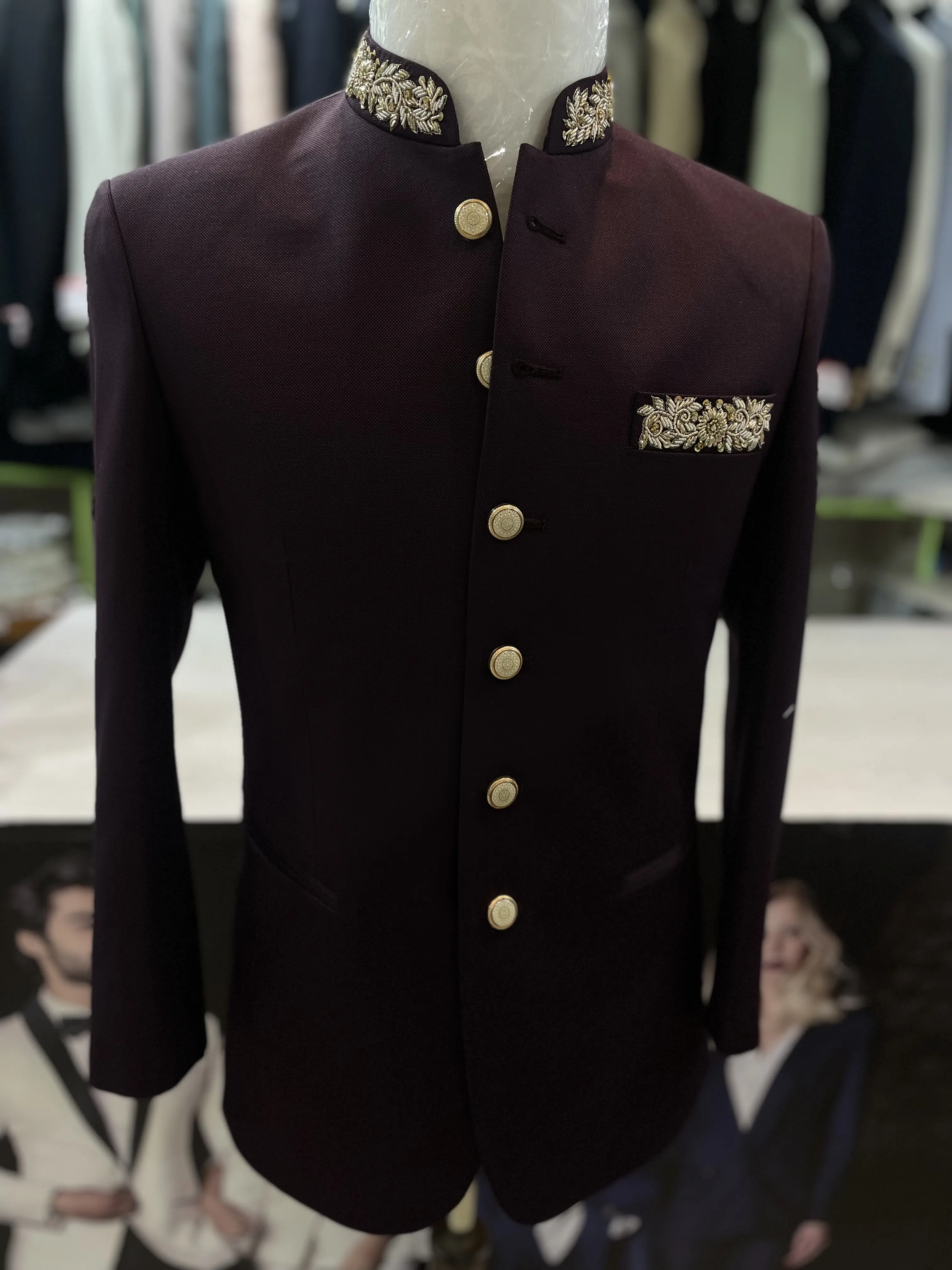 Tailored from a premium suiting fabric with a smooth matte finish, the design features a structured silhouette, standing Nehru collar, and hand-finished detailing that speaks of understated luxury. The minimalist lines and deep black tone create a statement of quiet power and sophistication.