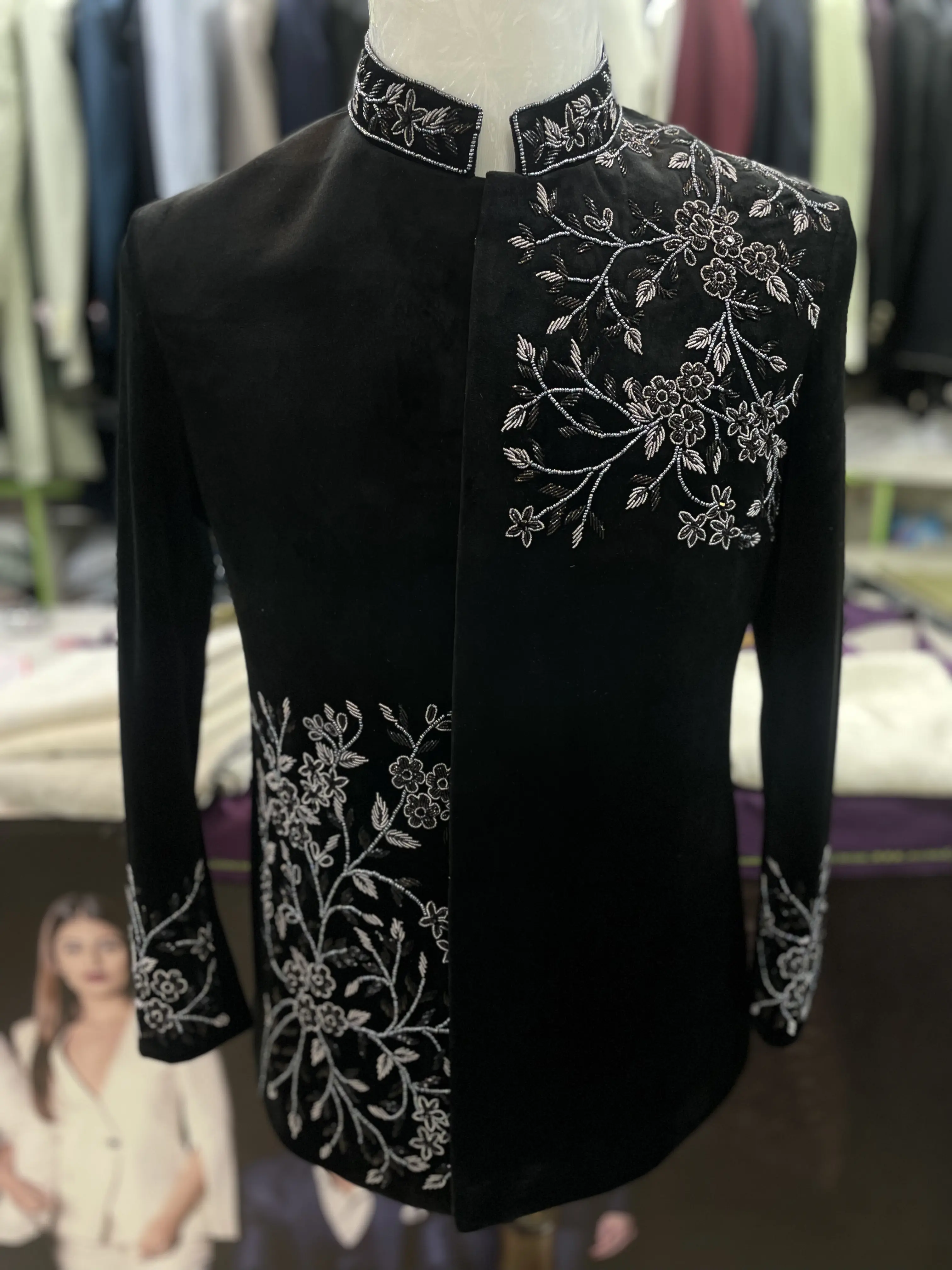 Tailored from a premium suiting fabric with a smooth matte finish, the design features a structured silhouette, standing Nehru collar, and hand-finished detailing that speaks of understated luxury. The minimalist lines and deep black tone create a statement of quiet power and sophistication.